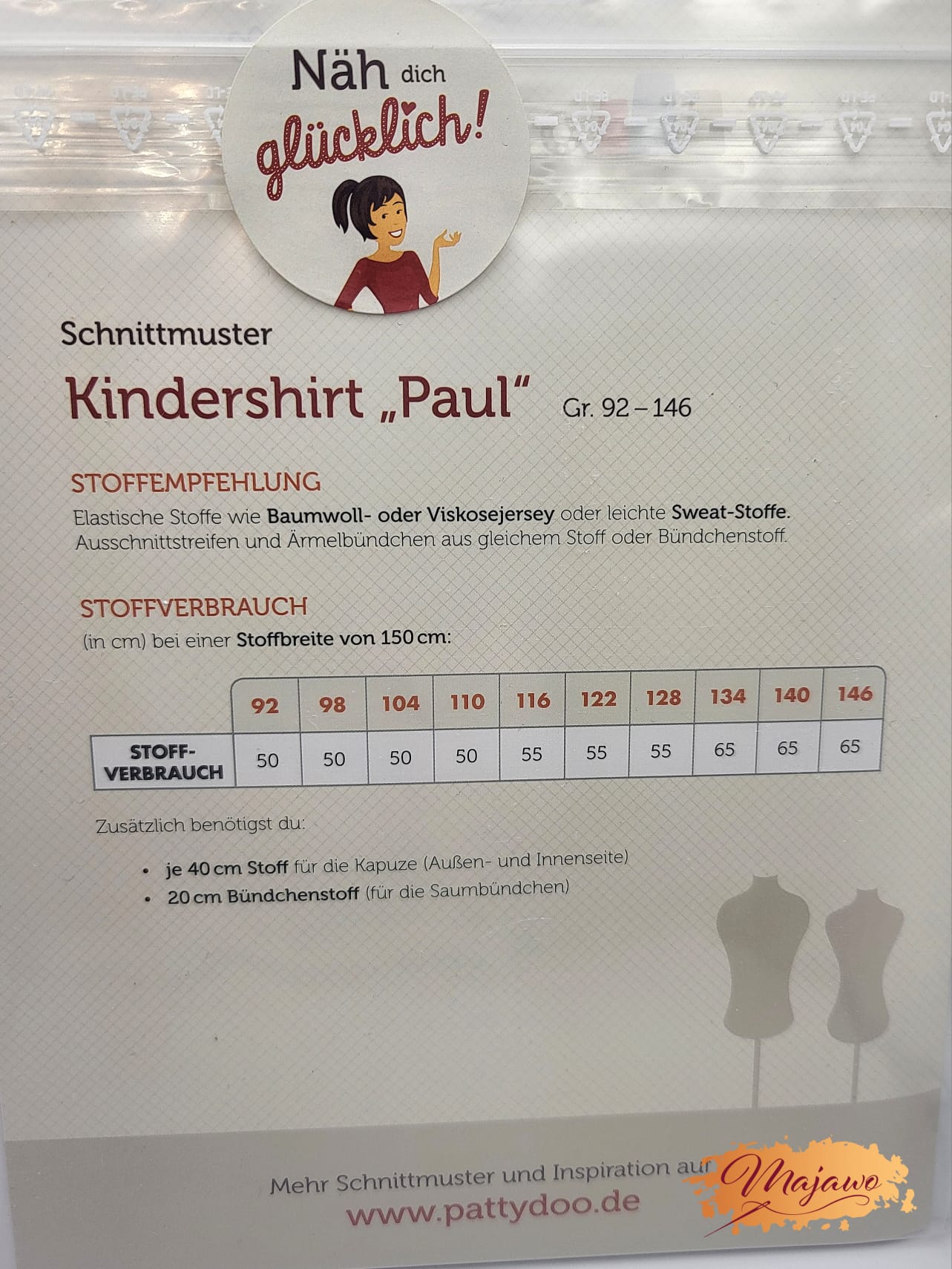 - Handliches Booklet mit Maßtabellen, Zuschnittplänen und Tipps zum Anpassen der Größen + Videoanleitung
